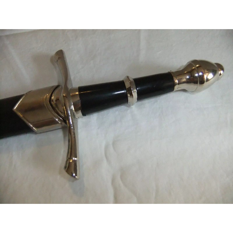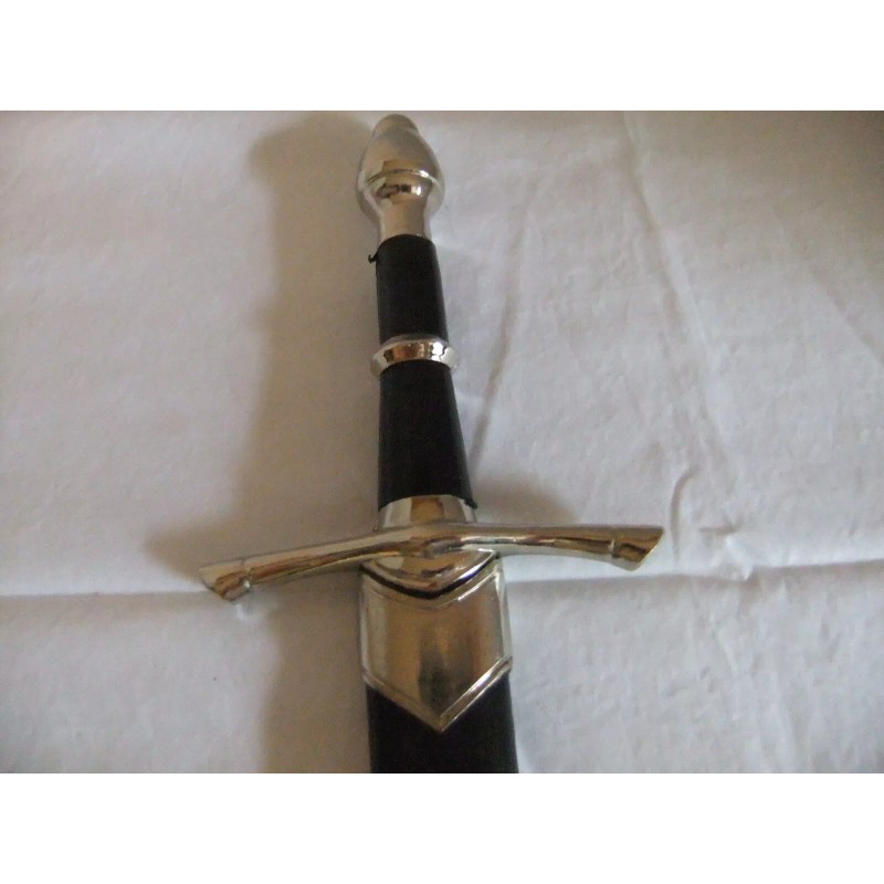 This offering is for a Claymore Dagger (new). It is a reproduction of the daggers used by the Celtics in the Scottish Highlands during Medieval times. Although “Claymore” was originally a Scottish Gaelic term describing a very large two-handed long sword, it has come to define any bladed weapon with a cross hilt of forward sloping quillons and quatrefoil terminations. The dagger being sold follows the design requirements exactly. It is terrific for display in a Celtic/Medieval collection or for use in the theatre.
