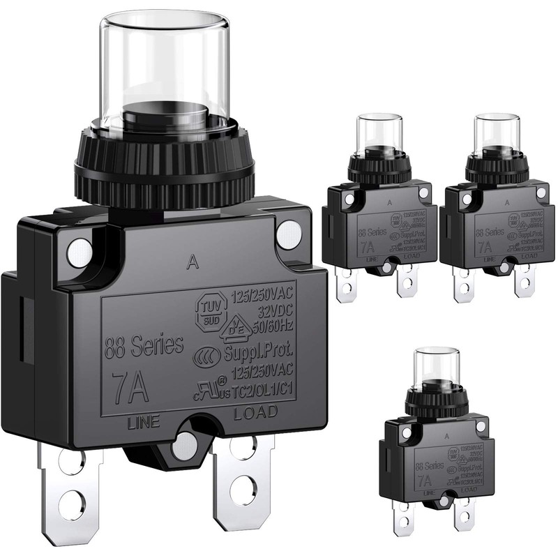 CLDIY 7A Circuit Breaker with Thermal Overload Protection, 88 Series Manual Push Button Reset with Quick Connection Terminals and Waterproof Keycap 32VDC or 125/250VAC, 4 Pieces
