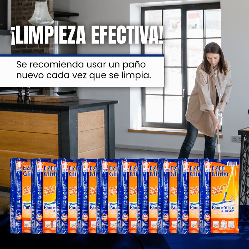 - PAÑOS SECOS | Mantén tu hogar limpio y fresco con nuestros paños de repuesto. Se adaptan a todas las superficies (20cm x 27cm) y se sujetan fácilmente a la fregona para una limpieza sin esfuerzo.