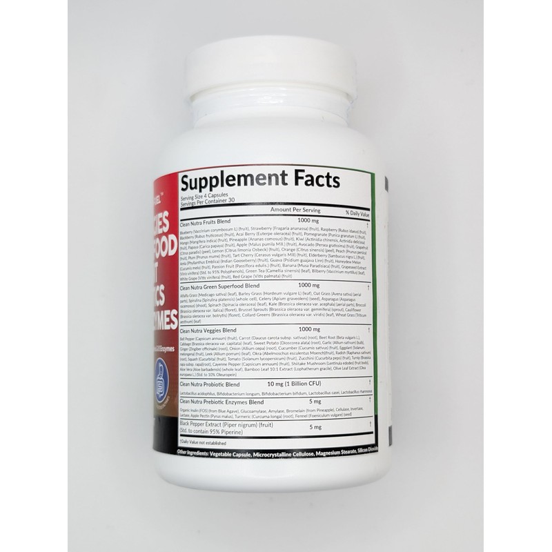 Immerse yourself in the comprehensive nutrition offered by Clean Nutraceuticals Fruits and Vegetable Supplements. Our Superfood supplement features a carefully selected blend of greens and reds, including potent Spirulina, Chlorella, and an assortment of greens supplements.What sets our formula apart is the 10000 blend of prebiotics and probiotics that significantly enhances gut health. The interplay between prebiotics and probiotics fosters a robust gut microbiota, leading to improved digestion, better nutrient absorption, and a boosted immune system.Our blend does not stop at fruits and veggies. We have enriched our formula with a powerful combination of digestive enzymes. These enzymes are instrumental in breaking down the food you eat, allowing your body to access and utilize the nutrients more efficiently.The powerhouse duo of Spirulina and Chlorella brings the benefits of the sea to your daily regimen. Renowned for their high nutrient density and antioxidant properties, these superfood greens assist in detoxifying the body while nourishing it simultaneously.Each bottle of our superfood supplement contains 120 vegetable capsules, providing you with a month's supply of all-encompassing nutrition. Proudly made in the USA, our supplement offers quality you can trust.By choosing Clean Nutraceuticals Superfood Supplement, you are choosing a lifestyle of health, wellness, and optimal nutrition.