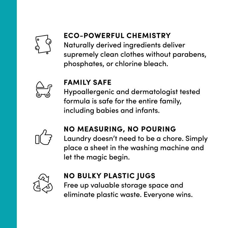 - ECO-POWERFUL CHEMISTRY & NATURALLY DERIVED INGREDIENTS: Detergent sheets deliver supremely clean clothes without parabens, phosphates, chlorine bleach; Dermatologist tested, safe for the whole family, even babies and infants