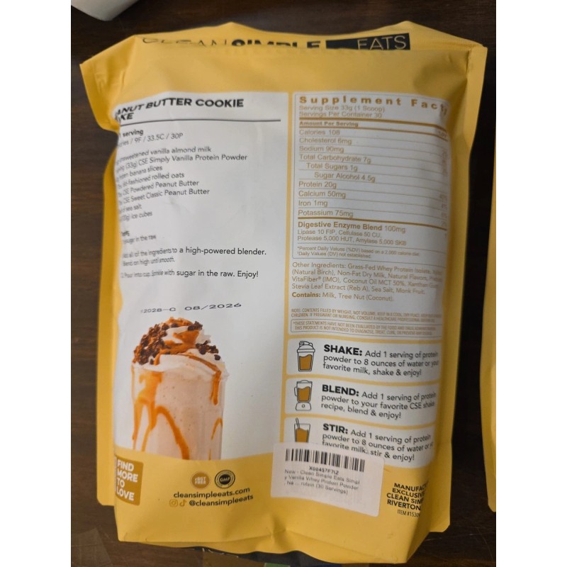 Clean Simple Eats Vanilla Whey Protein Powder 20 Grams Protein 30 Servings