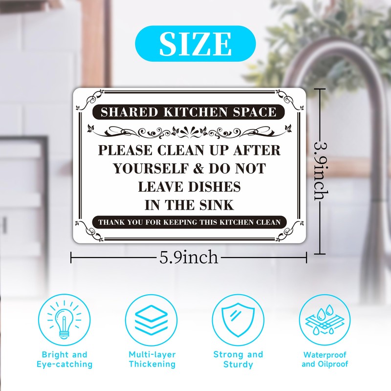 - ✎【PACKAGING CONTENT】: You will receive a classical white please clean up after yourself sign sticker, which comes with adhesive backing and is very convenient to use, and the surface is a delicate matte with a certain thickness. This wash your dishes sign for kitchen measures 5.9x3.9 inches. Unlike regular stickers, our product has a certain thickness.