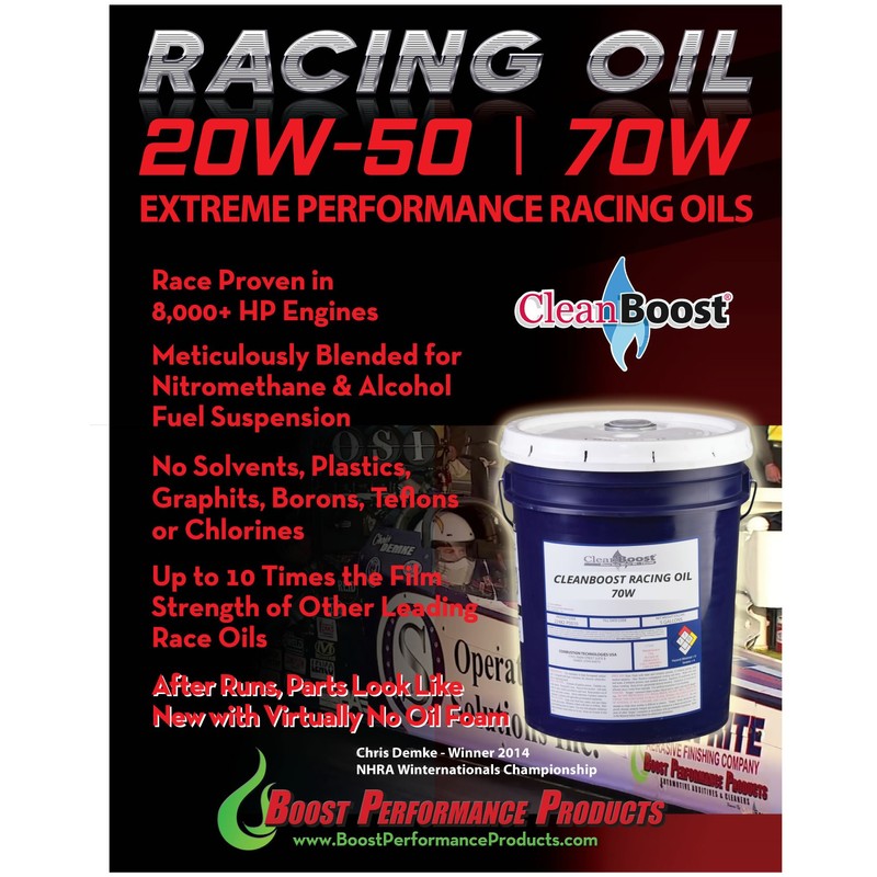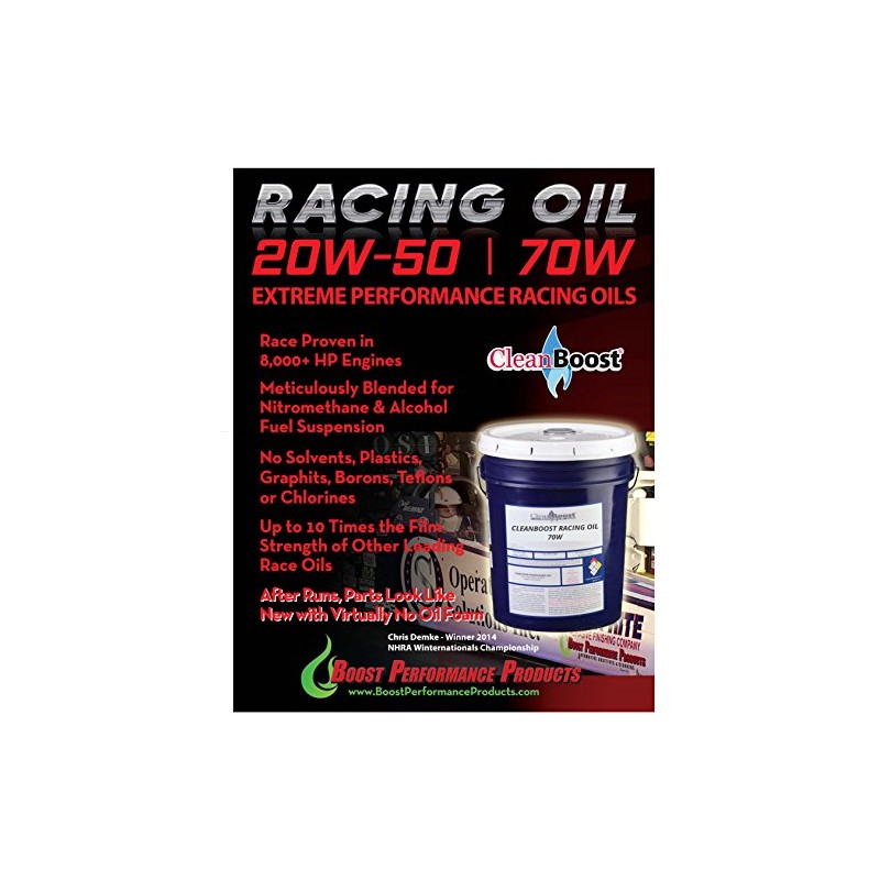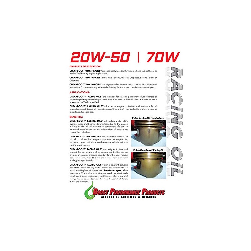 - CLEANBOOST RACING OILS are intended for extreme performance turbocharged or supercharged engines running nitromethane, methanol or other alcohol race fuels, where a 20W-50 or 70W oil is specified.