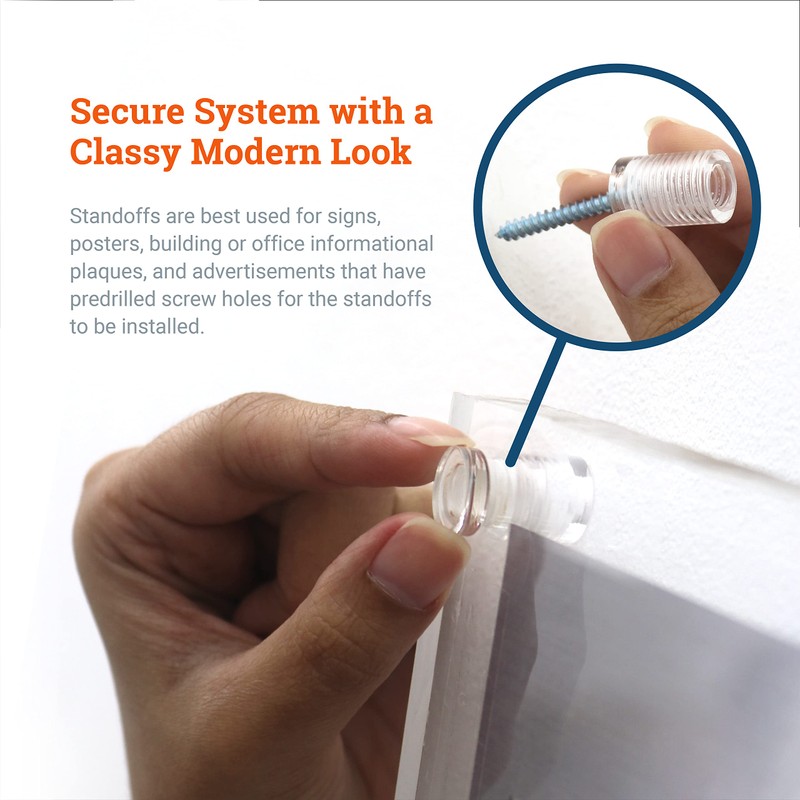 This standoff mounting hardware is a great way to showcase your company logo or name, informational signs, etc. Clear acrylic standoffs provide a subtle and modern look. They’re perfect for hotels, restaurants, shopping malls, airports, offices, and other commercial areas.