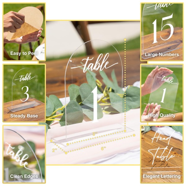 Clear Arch Table Numbers for Wedding, 5x7 Inch Arched Acrylic Table Numbers 1-15 with Acrylic Stands, Clear Acrylic Arch Tabletop Sign with Holder for Centerpiece, Reception, Wedding, Parties