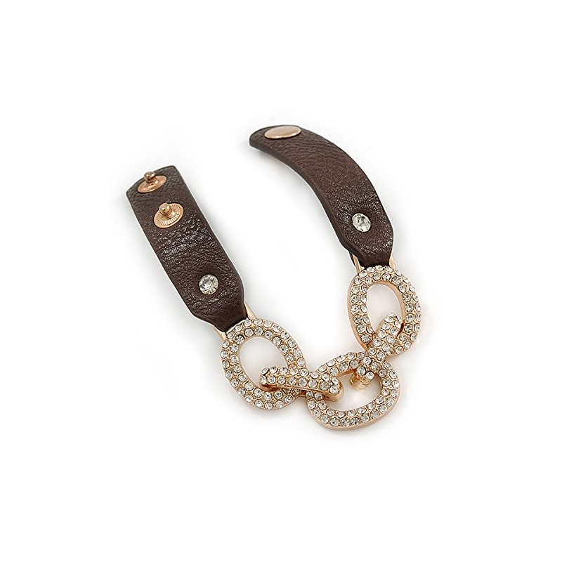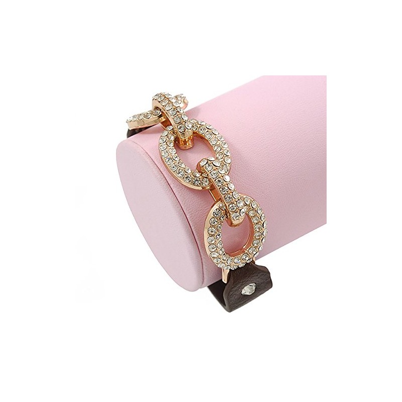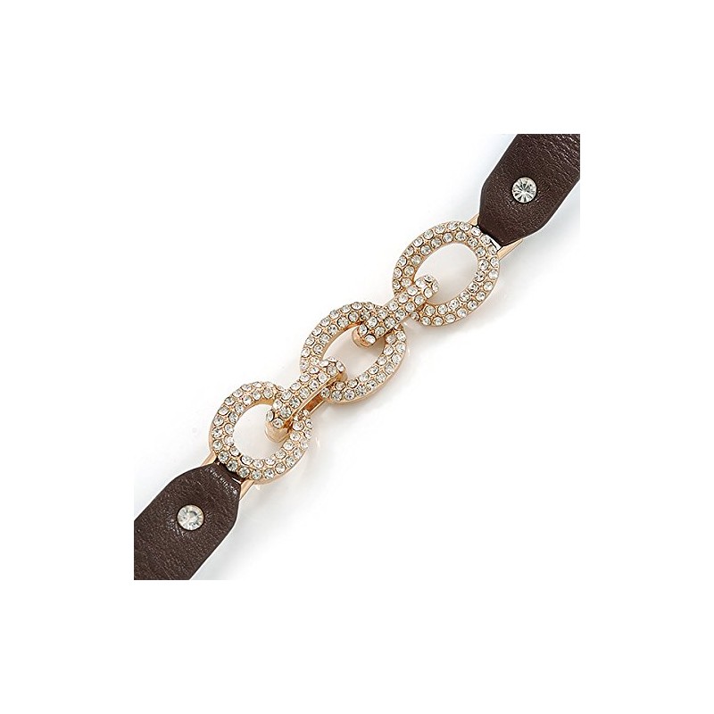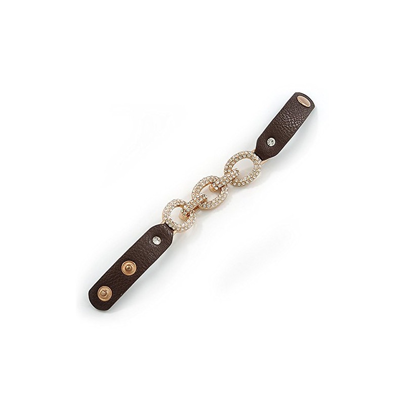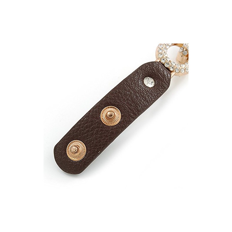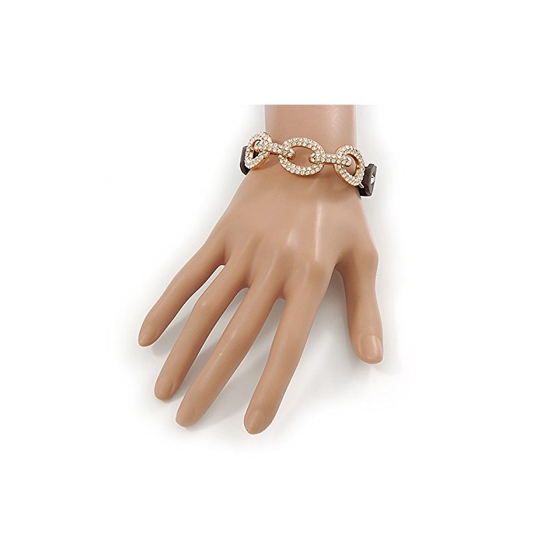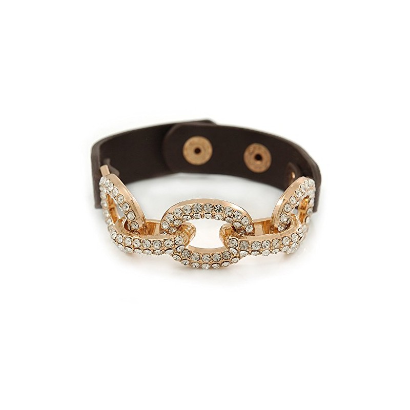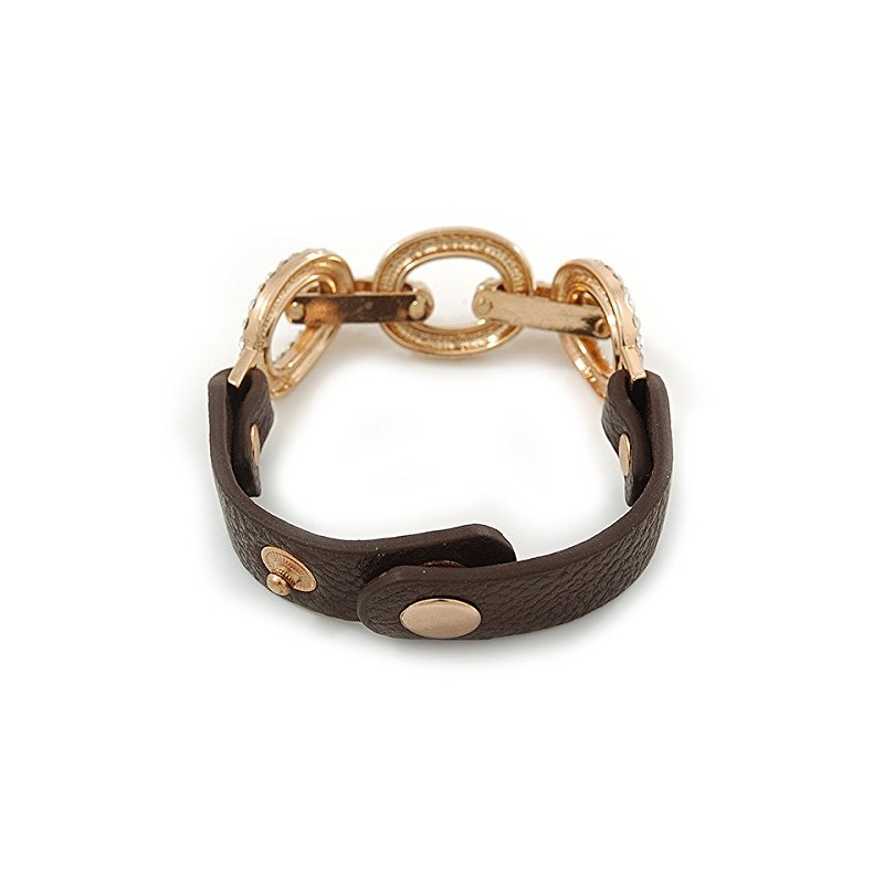 Clear Crystal Oval Link With Faux Brown Leather Bracelet In Gold Tone - 19cm L