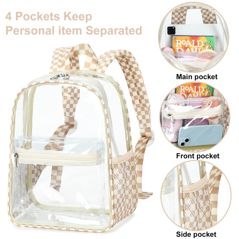 • Small clear stadium backpack has multiple pockets. 1 main compartment with dual zipper has enough room for your belongings like notebooks, 11inch ipad pro, wallet, sweatshirt or lunch; 1 front zipper pocket fits you charger, headphones, or keys; 2 mesh side pockets fit a water bottle and sport drink. (Not available for A4 size)
