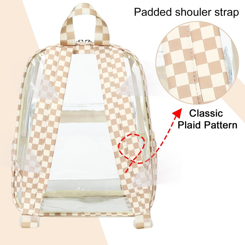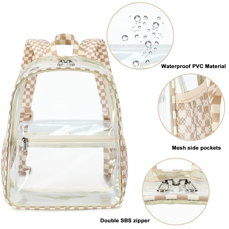 • The black clear plastic backpack will be much easier to wipe clean than fabric. Smooth transparent water resistance PVC material, just wipe it off with a damp paper. It won't get wet in rainy days. Mesh black white Plaid breathe design on the back makes your travel more comfortable.