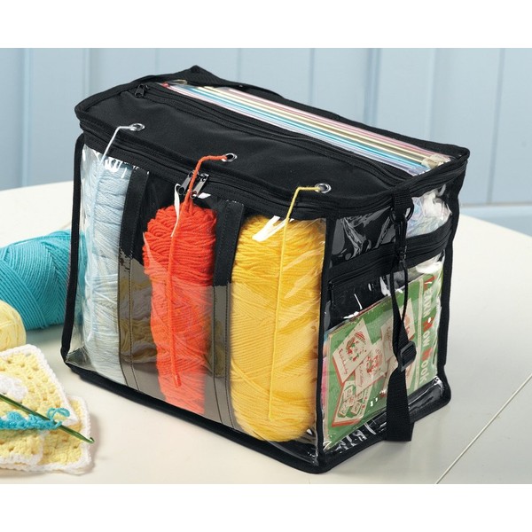 - Zippered compartment on the top of the bag, and another on the side, hold needles, scissors and other supplies.
