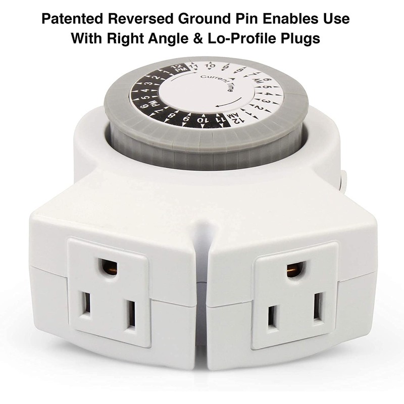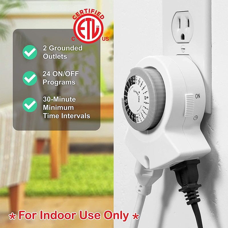 - The indoor timer has a compact and portable design to save space, when plugged into the bottom outlet of a duplex receptacle it leaves room to use the top wall outlet