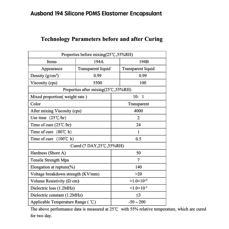 - Low-Stress Protection: Ideal For Electronic Devices That Require Low Stress, Ausbond 194 Provides Transparent, Low-Stress Protection, Preserving The Integrity And Performance Of Sensitive Electronic Components.Polydimethylsiloxane PDMS