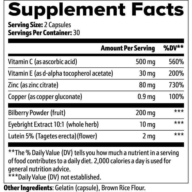 - Ingredients: Vitamin C (ascorbic acid) 500mg,Vitamin E (dl-a-tocopherol acetate) 30mg,Zinc (zinc citrate) 80mg,Copper (copper gluconate) 0.9mg,Bilberry (fruit) Powder 200mg,Eyebright Extract 10:1 (whole herb) 10mg,Lutein 5% (Targetes erecta) (flower) 2mg