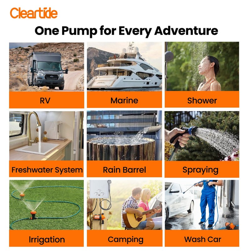 Cleartide DC Diaphragm Water Pump, 12V, 3.3 GPM, 50 PSI, Self-Priming 10FT, Self-Diagnosis & Dry-Run Protection, Built-In Pressure Switch, Water Pressure Booster Pump for RV/Camper/Marine/Outdoor