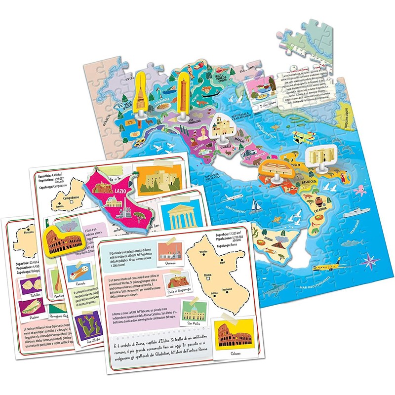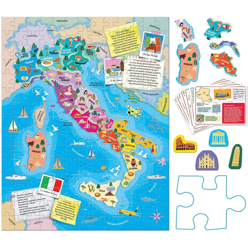 - Includes: puzzle tiles to reconstruct the "frame" with the seas and areas bordering Italy, shaped tiles of the regions, silhouettes of the most important monuments