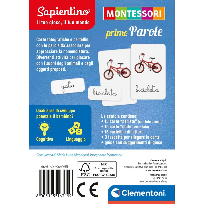 Clementoni 16319 Prime Words Cards Montessori Game 2 Years (Italian Version), Educational Game Made in Italy, Multi-Colour, One Size