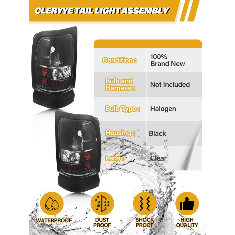 CLERYYE Tail Light Assembly Compatible with Dodge RAM 1500 2500 3500 1994-2001, RAM Brake Rear Lamp, W/O Bulb, Left and Right Side, Black Housing Clear Lens RAM94-01-H-BLACK