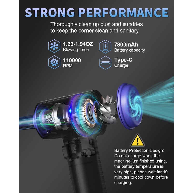 - 【 Elektronische PC Druckluftspray und umweltfreundlich】Dieser electric dust blower hat einen eingebauten 7800mAh-Akku, der mit einer einzigen Ladung 30-40 Minuten lang durchgehend laufen kann. Schnurloses luftdruckspray druckluft wird mit einem Typ-C Schnellladekabel geliefert, das das Gerät in 3-4 Stunden vollständig auflädt und über einen Computer, eine mobile Powerbank werden kann. Energiesparend und umweltfreundlich, perfekte Alternative zur luftdruckspray.