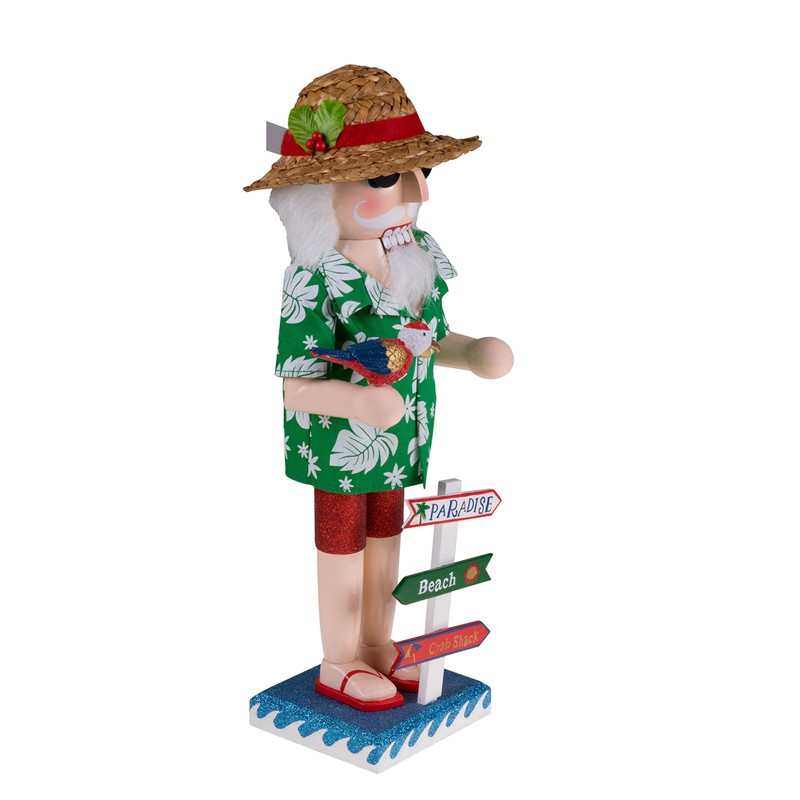 - GREAT DESIGN: Features a Santa nutcracker wearing a tropical hat and shirt and holding a parrot.