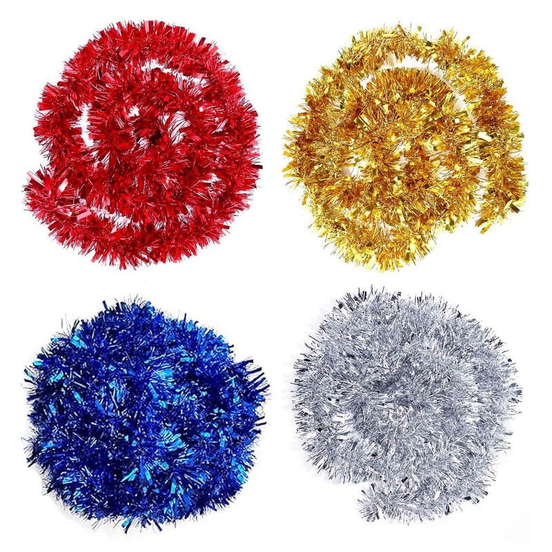- Shiny tinsel garland: bright colours and glitter effects beautify your house in a simple way. You can wrap it on the handrail of the Christmas tree or stairs or twist the two coloured tinsel garland together to use it