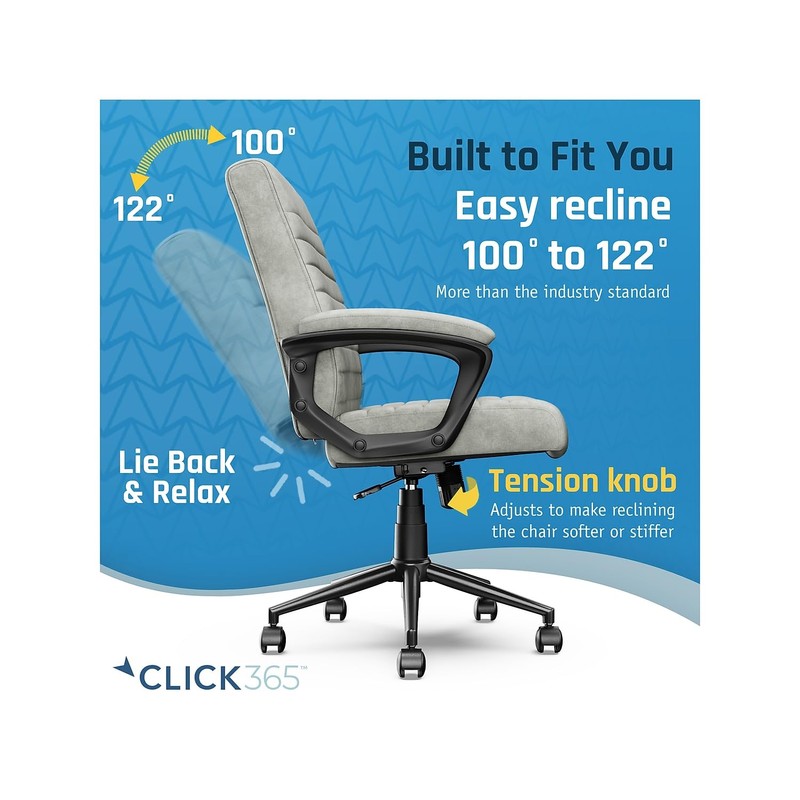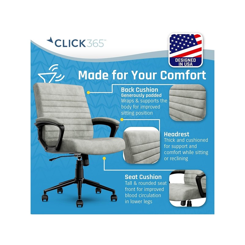 Bring relaxation to your busy workday with the Click 365 Extra Comfort Ergonomic Mid Back Desk Chair. This chair deliver American comfort with ultra plush padding in headrests, back rests and seat cushions. This chair has a contoured 5 inch thick seat cushion and reliable ergonomic support, providing long lasting comfort and is perfect for everyday use at home and in the office. Pneumatic adjustable height, a swivel base design, and top-graded smooth rolling caster ensure the office chair is easy to move and position. This desk chair is upholstered in premium durable fabric, high density foam, heavy duty metal base, with sophisticated stitching. You can purchase this chair with confidence.Features:Superior Comfort: Ultra plush padding keep you comfortable and relaxed whether you’re working or kicking backBuild to Last: Premium durable fabric, high density foam, heavy duty metal base, with sophisticated stitching. Enjoy the mobility with the top-graded smooth rolling casterJust The Right Fit: Adjustable seat height, recline angle and tilt tensionQuick and Easy Assembly: Assembly is quick and easy with all the tools providedQuality: Every chair we made is BIFMA certified, only high quality virgin materials are usedItem Shape: L-ShapedSpecifications:Weight Capacity: 275 lbs