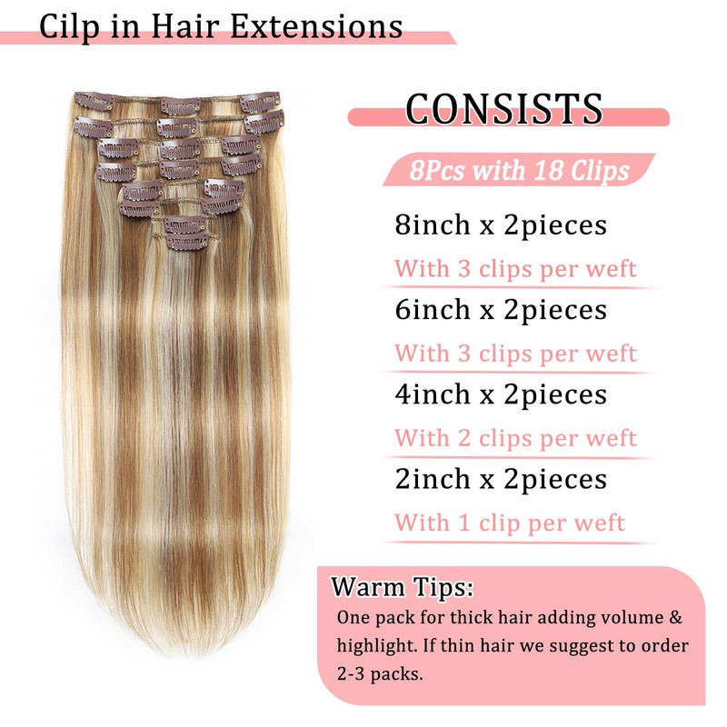 - Real Hair Extensions Clip in Human Hair Specification: Achieve your desired look with our natural thickness options, invisible, lightweight, and comfortable. Use 1 pack for fine hair or 2-3 packs for a full, voluminous style. Each set includes 8 pieces with 18 clips, and added 2 extra clips for your convenience.