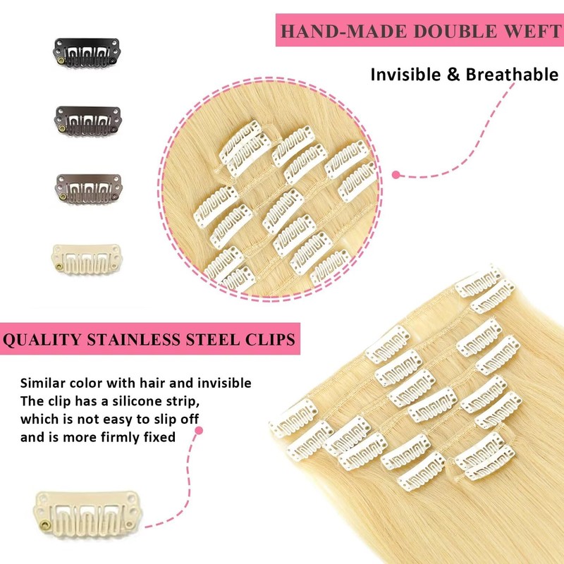 Clip in Hair Extensions Real Human Hair Clip ins 100% Human Hair Extension for Women Clip in Extensions 8pcs Per Set with 18 Clips Double Weft (22 Inch 90g #613 Bleach Blonde)