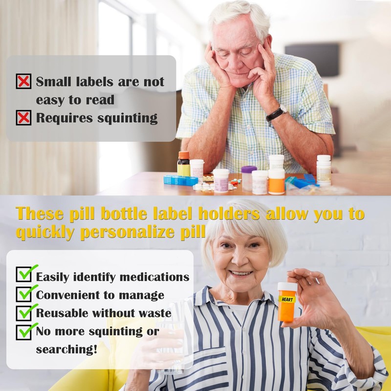 • Clear and Easy Medication Identification: No more confusion or searching! Our clear label holders allow you to personalize your pill bottles for identification. Quickly locate the right medication with ease, ensuring accurate and efficient medication management
