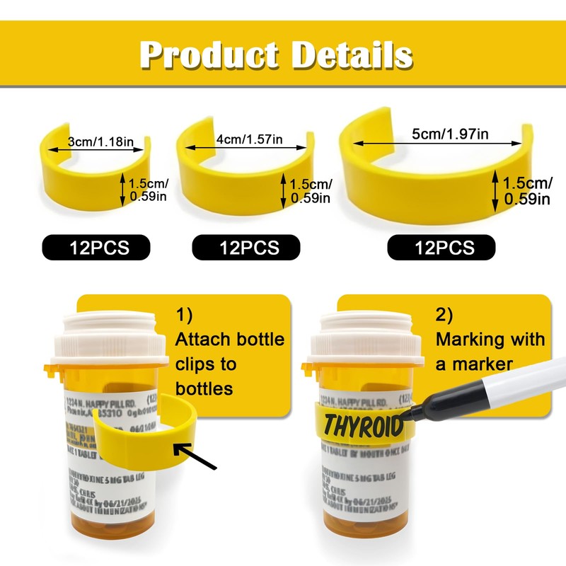 • All-in-One Comprehensive Kit: Our Pill Bottle Clip Set is designed to simplify your medication management. Choose from 9, 18, or 36 clips in three different sizes, along with a mini permanent marker. This all-in-one package provides everything you need to keep your medications organized and labeled effortlessly