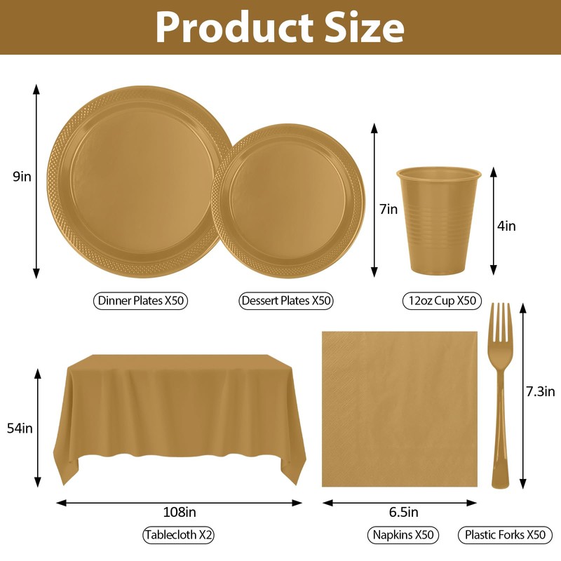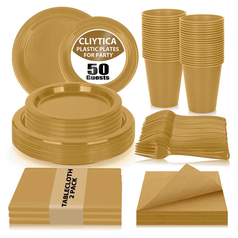 - 【252 PCS GOLD PARTY SUPPLIES KIT】Elevate Your Event Planning with CLIYTICA's plastic gold plates! The set includes 50 9" Gold plastic disposable plates, 50 7" dessert plates, 50 12oz plastic cups, 50 forks, 50 absorbent napkins and 2 waterproof tablecloth. Whether it is a wedding banquet, anniversary or elegant birthday party,our plastic plate set adapts effortlessly to any occasion while satisfying every guest's practical needs