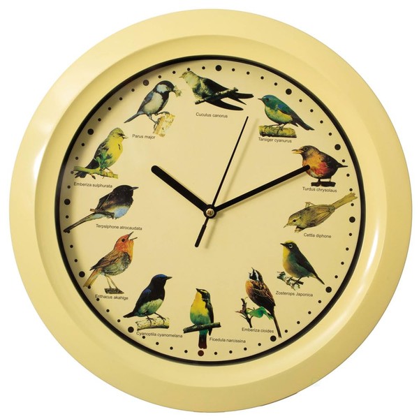 Clockswise 12" Round Decorative Singing Bird Wall Clock Battery-Operated with Wild Nature Sounds Hourly Chime and Non-Ticking for Home Office Kitchen Dining Bedroom Classroom and Living Spaces, Yellow