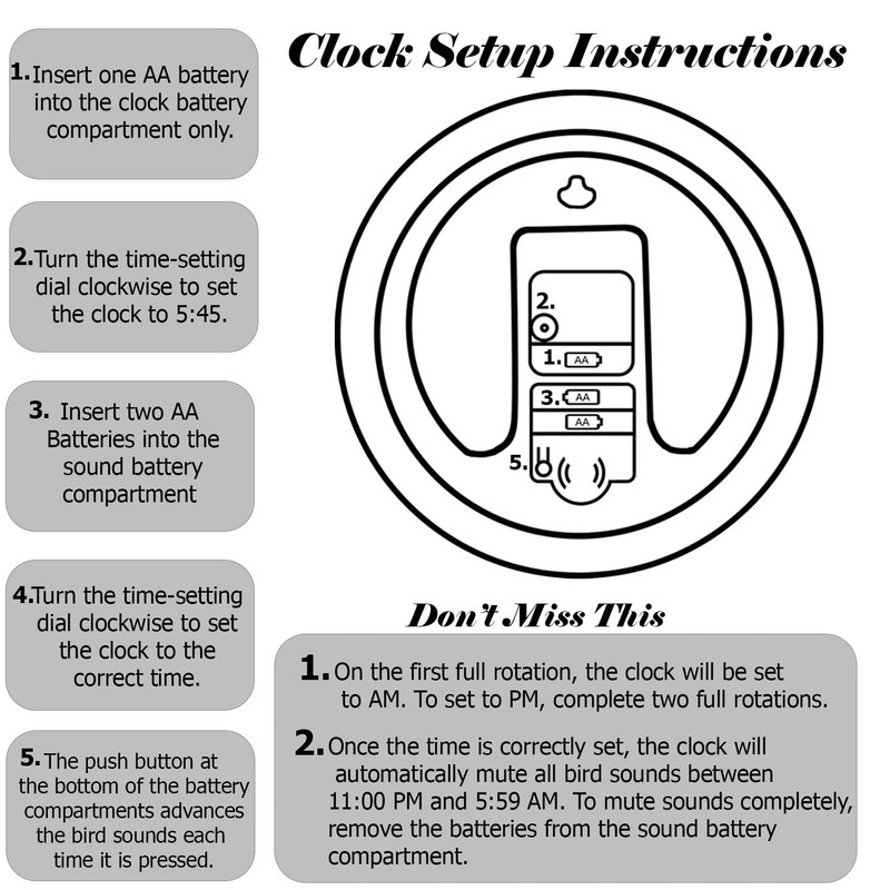 • Operating Instructions: The push button at the bottom of the battery compartments advances the bird sounds each time it is pressed. Once the time is correctly set, the clock will automatically mute bird sounds between 11:00 PM and 5:59 AM. To mute all sounds completely, remove the batteries from the sound battery compartment. When adjusting the time such as for DST on/off, always turn the time-setting dial clockwise to ensure the bird playlist remains accurate.