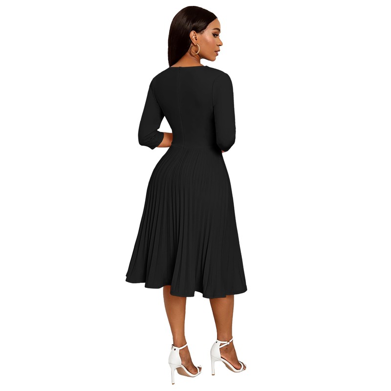 CLOCOR Midi Dresses for Women Casual Wrap Flared Pleated Dress A Line 3/4 Sleeve V Neck Church Cocktail Wedding Guest Dress Black 2XL