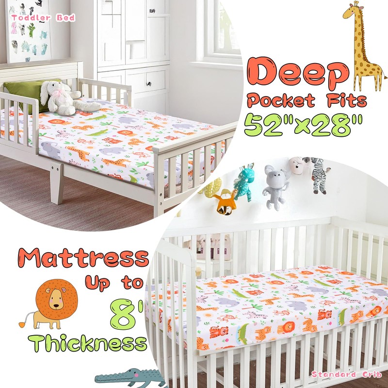 - 【PERFECT FIT】Dimension 52*28*5‘’.The animal fitted crib sheet for boys girls fits all standard crib mattress,making this item perfect for transitioning your little one from their crib to a toddler bed.The elastic band design ensures that the sheet stays securely in place, minimizing any sliding or shifting.