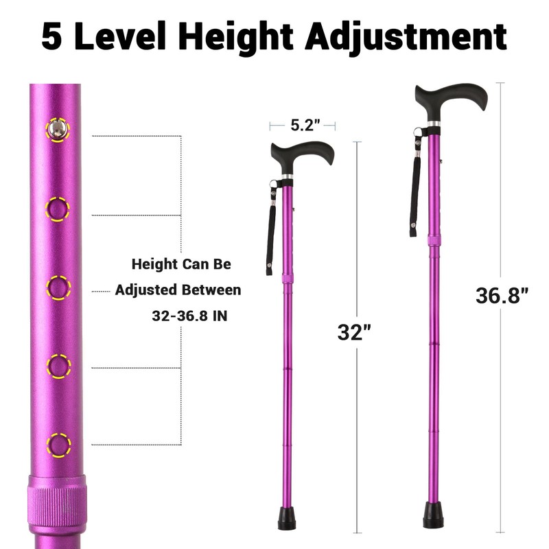 - LIGHTWEIGHT & ADJUSTABLE: Foldable cane it is made of ultra-lightweight and corrosion-resistant aluminum with a 1.2 mm thick tube, 1.5 times thicker than others, enough to support 200 - 250 pounds of weight. The cane has 5 levels of height adjustment in 1 inch increments and the height can be adjusted between 32" and 37", making it a great walking canes for seniors, women & men for balance.