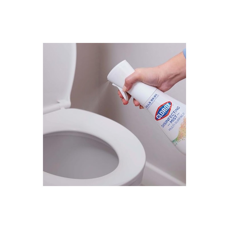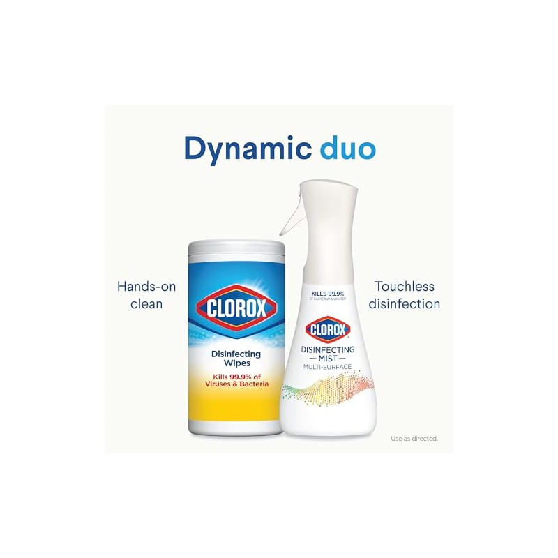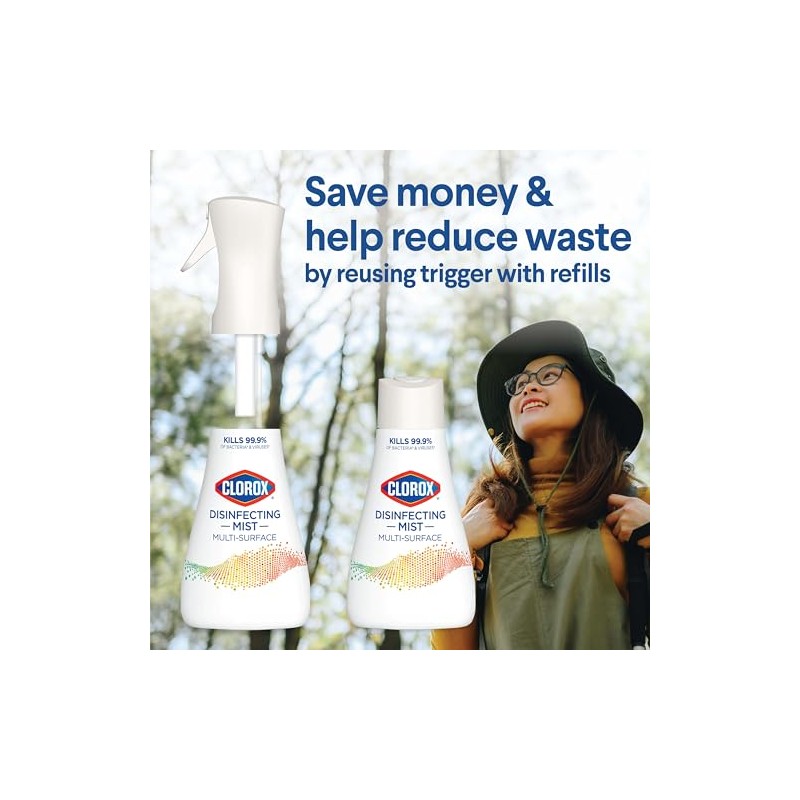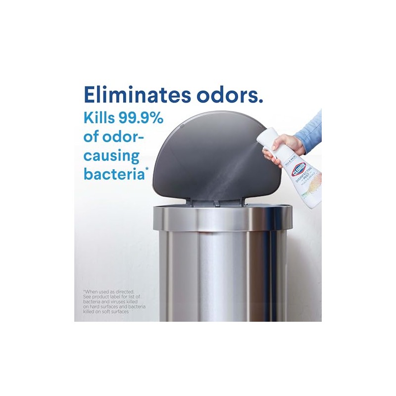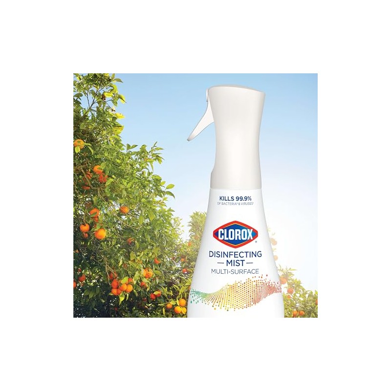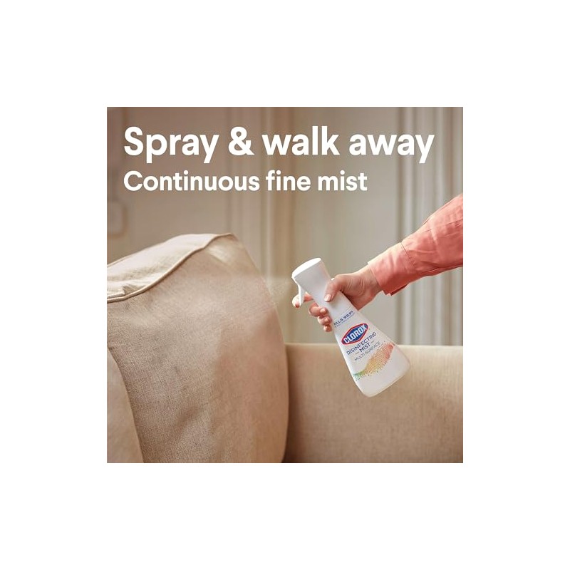 Disinfect hard surfaces*, eliminate odors and sanitize fabrics with Clorox Disinfecting Mist. 3 in 1 disinfectant, deodorizer and fabric refresher* kills 99.9% of bacteria and viruses**, including COVID 19***. Help protect your home from the spread of germs on surfaces, including during cold and flu season* by spraying on high touch surfaces like doorknobs, countertops, and faucets. The continuous sprayer creates a fine mist of the color safe**** formula to sanitize and refresh hard to wash fabrics in your home. *All in one product disinfects hard surfaces, deodorizes the air, and sanitizes bacteria on soft surfaces when used as directed. **Use as directed. See product label for list of organisms. Food contact surfaces must be rinsed with potable water. Pre test in an inconspicuous space before use. Do not use on marble or copper. ***Kills SARS CoV 2 on hard, non porous surfaces. ****When used as directed. *****Use as directed. Rinse required on incidental food contact surfaces.