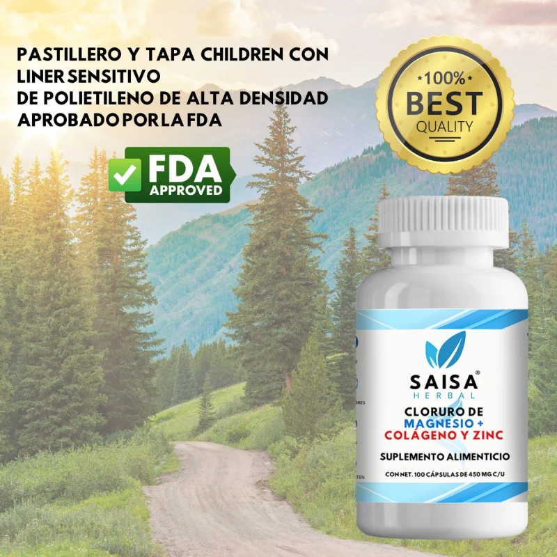 Cloruro De Magnesio + Colágeno Y Zinc | 100 Cápsulas | Suplemento Alimenticio Sin sabor | Saisa Hebral | Huesos y musculos fuertes, cuidado de piel