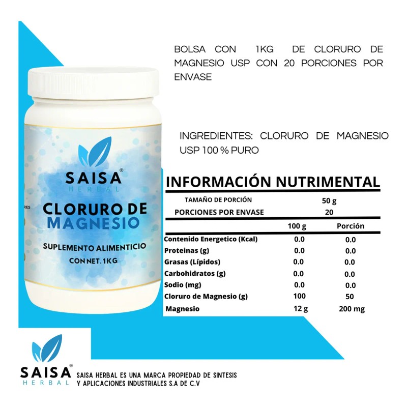 Cloruro De Magnesio Usp 1 kg | Suplemento Alimenticio | Saisa Herbal Sabor Natural | 100% puro | Apoyo a huesos, musculos, digestión