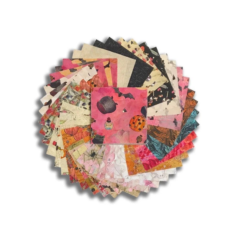 Sue Zipkin Full of color Halloween Charm packs. Beautiful new colors for Halloween this year. These are 5" die-cut, charm packs. These are professionally die-cut for accuracy. You will receive 57 in each pack. 19 different prints. Take advantage of my buy more, save more discount. I also combine shipping. This is, of course, 100 percent quilt Shop quality cotton fabric from Clothworks designed by talented fabric surface designer, Sue Zipkin. This is enough to make a nice sofa throw. You need 120 5" blocks for a twin size quilt.