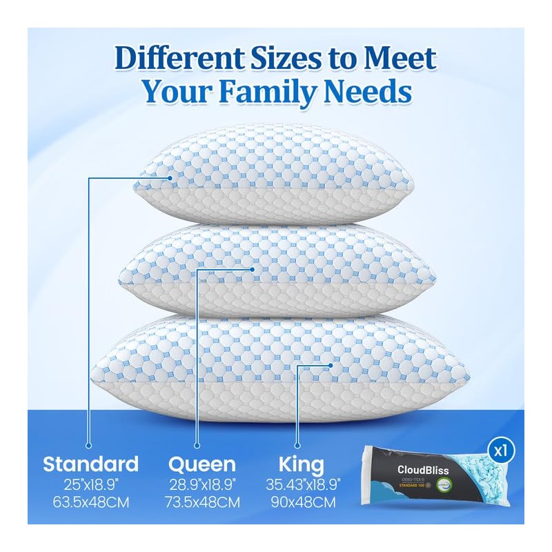 - Multiple Sizes to Fit Your Need: We offer three pillow sizes to cater to individual preferences and sleeping environments: Standard Size (25"*18.9"), Queen Size (28.9"*18.9") and King Size (35.4"*18.9"). With these versatile size options, our pillows ensure everyone can find the perfect fit to enhance their sleep quality and comfort