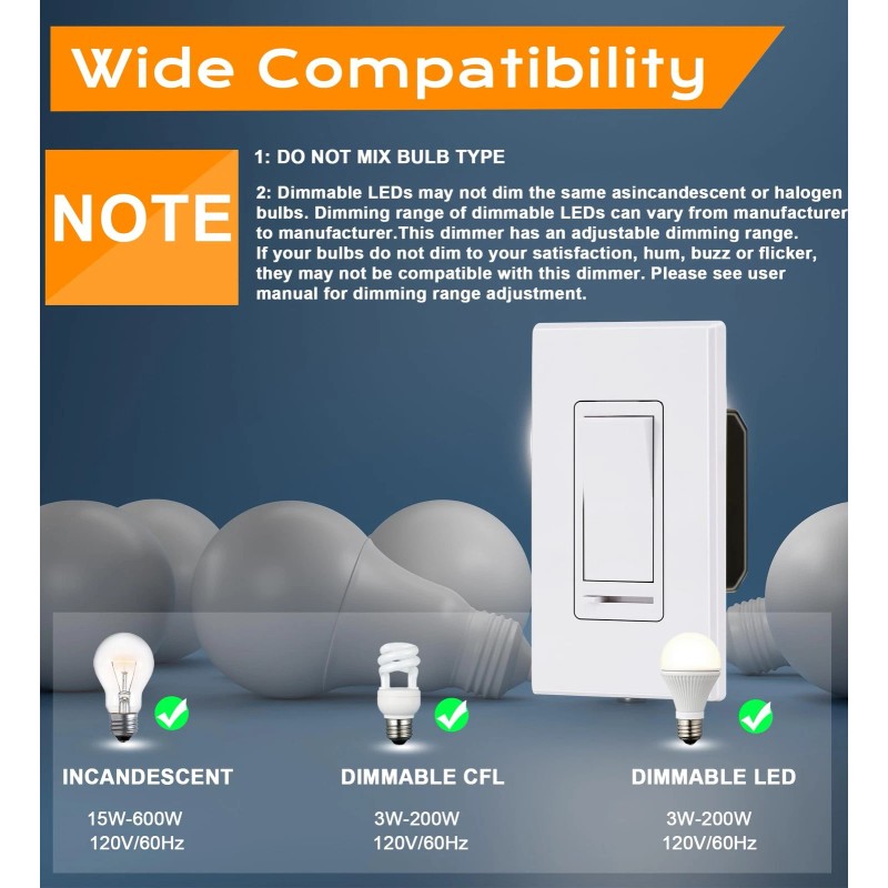 • 600W max Incandescent; 150W max dimmable LED/CFL,120VAC, 60Hz*Fully compatible with Cloudy Bay LED light fixtures,600W max Incandescent,150W max Dimmable LED/CFL,120VAC,60Hz *Not compatible with smart lighting fixtures