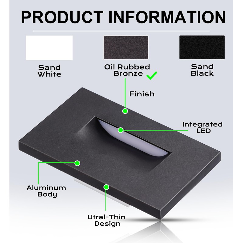 - ✔SUIT YOUR HOME STYLE: Used on 120VAC.The sleek LED step light has a beautiful oil rubbed bronze finish face plate(2-7/8" height,4-3/4" width) which blends perfectly with the wall.Walking up or down the stairway you will never find it protrude too much from the wall.