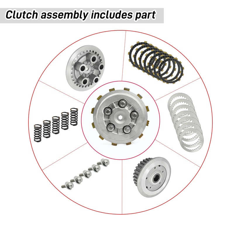 - 【PACKAGE】1 x Oil Filter 1 x O-Ring 5 x Washer Bolt 5 x Springs 1x Pressure Plate,1x Center Inner Hub 1 x Gasket 7 x Clutch Plat 7 x Friction Plate