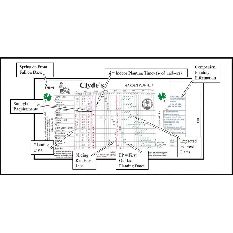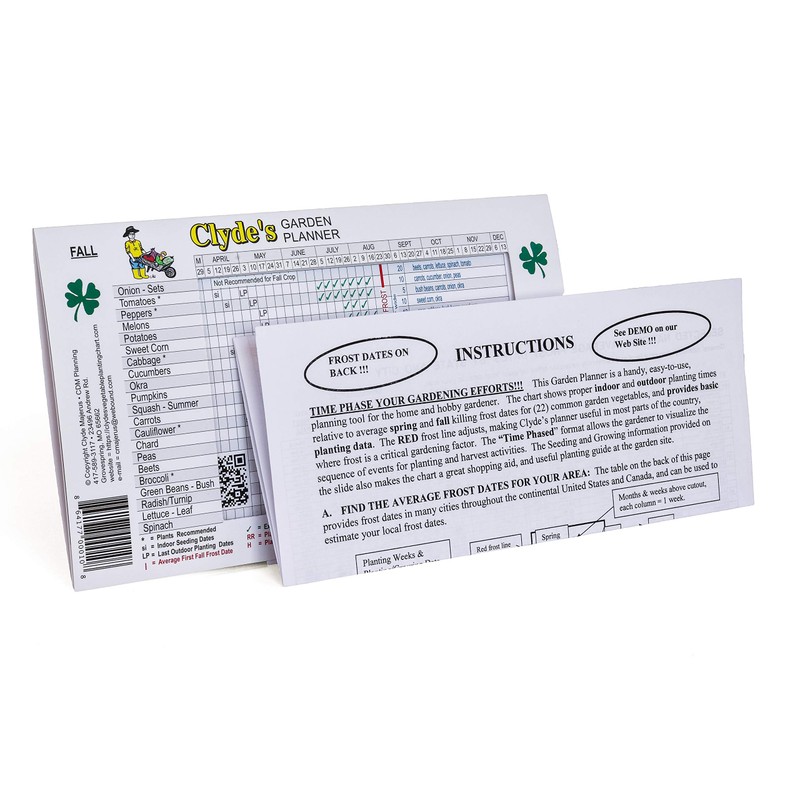 Clyde's Garden Planner is a unique, and handy, Vegetable Planting Slide Chart which presents gardening events in a time-phased format, using a horizontal calendar so that it is possible to see the entire Planting, Growing, and Harvesting period at a glance, (Chart Size = 51/8" x 81/2", 12 Point Cardstock Paper).