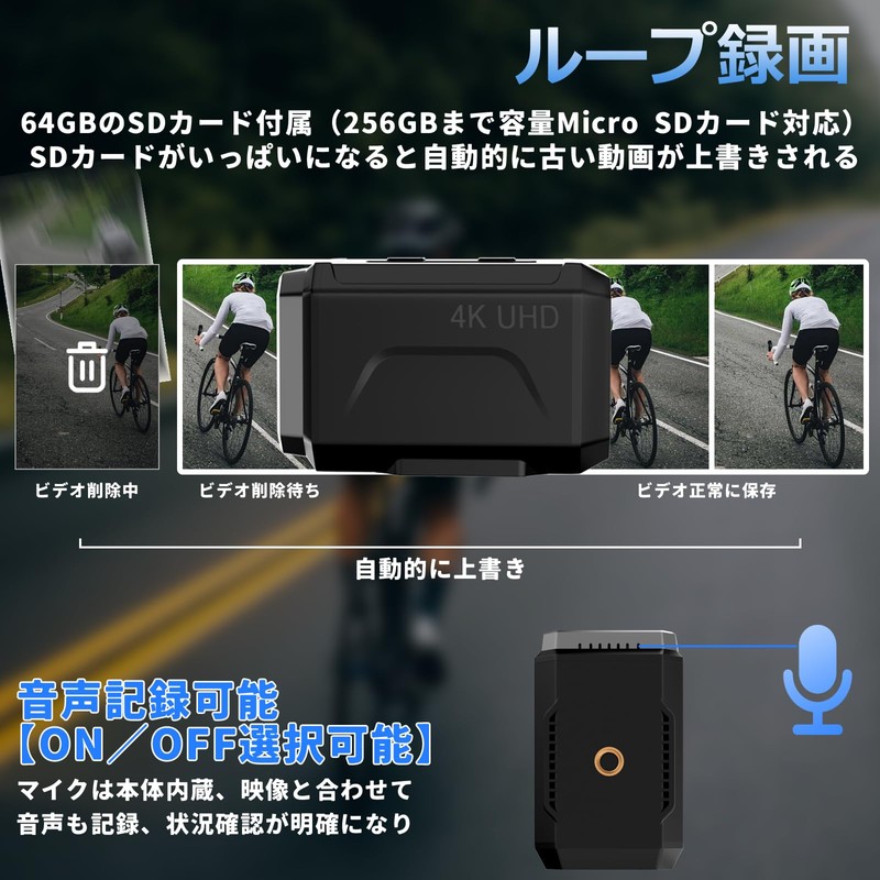 - Circulation Recording & 64 GB SD Card Included: The bicycle drive recorder has a loop recording function, and the store includes 1 64 GB SD card. When the recording capacity is full, it automatically overwrites old footage and records new footages, so you can record unlimited footage without worrying about it being lost in the middle of the way. Memory card supports up to 256 GB
