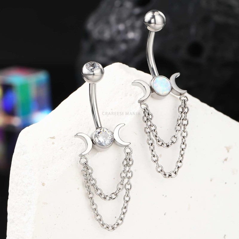CM Crareesi Mania Moon Phase Belly Button Piercings Dangling Double Chain 14 Gauge Opal/CZ Belly Button Piercing 316L Stainless Steel Belly Button Piercing Jewellery for Women, Cubic Zirconia
