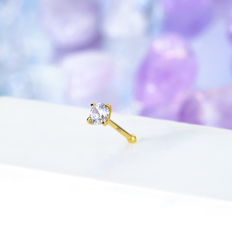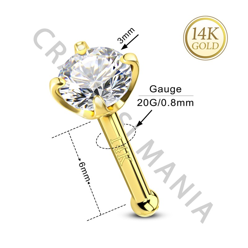 CM Crareesi Mania Nose Stud 14K Real Solid Yellow Gold Nose Studs 20Gauge Prong Set Cubic Zircoia Diamond Straight Bar Nose Piercing Jewellery