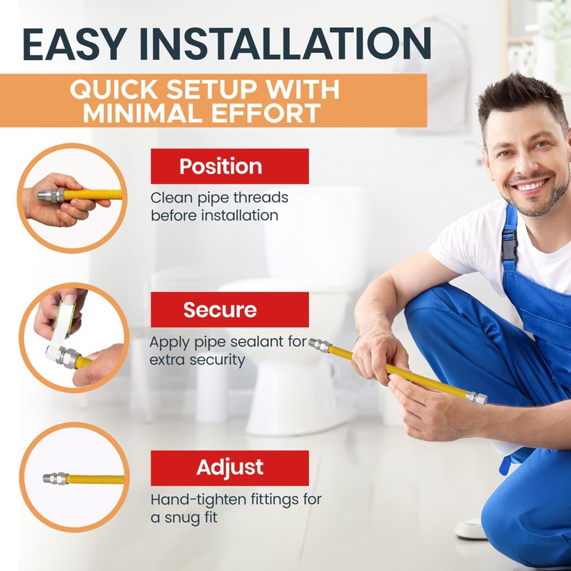 - EASY INSTALLATION & SECURE CONNECTION: No special tools are needed for installation—simply clean the pipe threads, apply sealant, and thread the fittings onto the manual shut-off valve. This flex gas line provides a secure, leak-free connection for gas stove connectors, gas dryer hoses, and hot water heater gas lines. Always test for leaks using a gas leak test solution to ensure safety before operating any gas piping system.