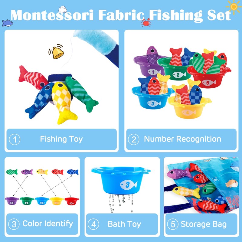 - 【Montessori Toys for 1 Year Old Kids】The Montessori toy includes 15 small fish, 5 stackable fish bucket, 1 fishing rod and 1 storage bag. It is a great learning toy for babies 6 to 12 months and 1 2 3 4 5 years old