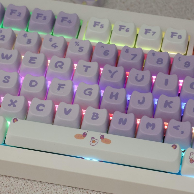 - CUTE CUSTOM THEME KEYCAPS These custom keycaps are some kitty theme cute keys,including 2 spacebars(one of them is 5-side dye sublimation) and lots of novelty cute keys.